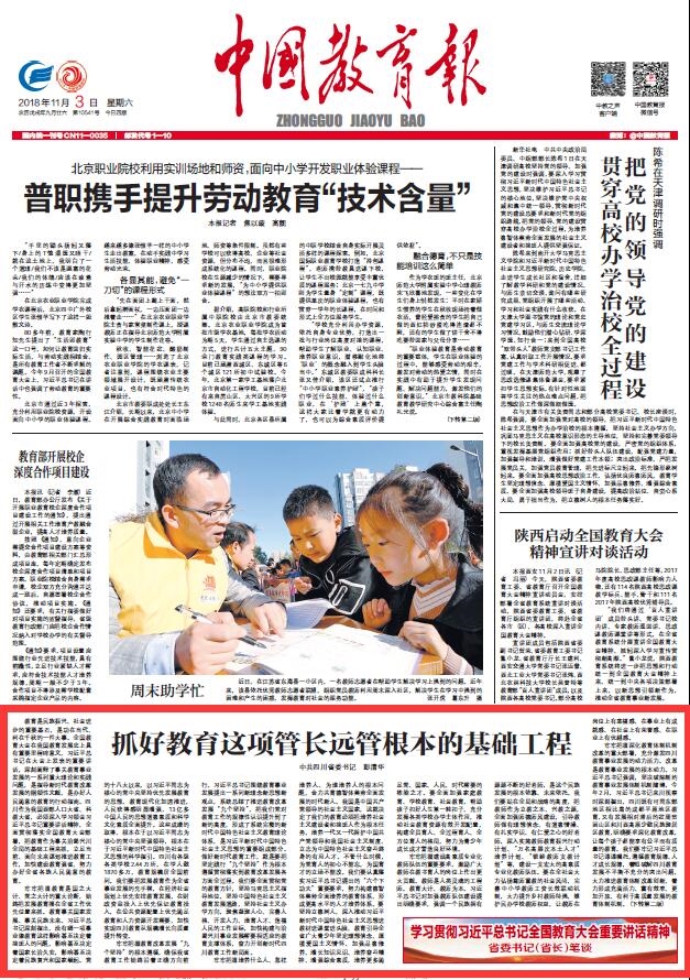 11月3日,《中国教育报》头版“学习贯彻习近平总书记全国教育大会重要讲话精神 省委书记(省长)笔谈”栏目刊载四川省委书记彭清华的署名文章《抓好教育这项管长远管根本的基础工程》,四川在线今日予以转载: