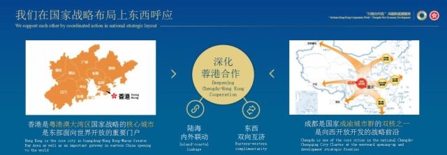 香港是享誉世界的国际金融、贸易、航运和创客中心,成都正着力建强全国重要的经济、科技、金融、文创、对外交往中心和国际综合交通通信枢纽功能,独特的城市分工将带来更广阔的合作空间。
