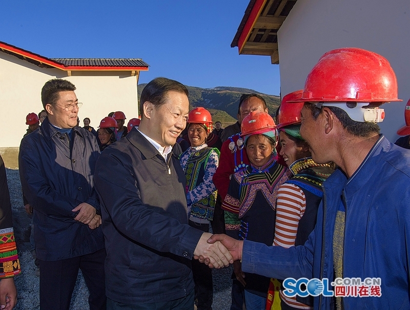1月2日,省委书记彭清华到凉山州昭觉县普诗乡李子村调研,了解脱贫攻坚工作推进情况,看望慰问在易地扶贫搬迁安置点参与房屋建设的当地彝族群众。记者 欧阳杰 摄