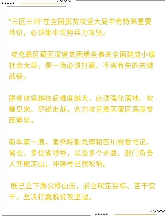 凉山要高质量完成“两不愁、三保障”任务难度很大,还有一系列特殊难题,这些问题解决得如何,直接关系凉山脱贫攻坚成败,也会影响全面建成小康社会的成色,事关全省全国大局。为此,必须持续抓好产业发展就业增收、安全住房建设、补齐教育医疗短板、禁毒防艾、移风易俗等重点工作,持续提升脱贫质量,全力打好凉山彝区脱贫攻坚这个标志性战役。中央明确提出“2019年底前在藏区基本消除绝对贫困”的要求,这是我们推进藏区脱贫攻坚必须完成的硬任务。藏区州县要抓紧攻坚冲刺,聚焦“两不愁、三保障”目标,倒排工期、细化责任、加强统筹,坚决完成今年全部脱贫摘帽任务,夺取藏区脱贫攻坚决定性胜利。