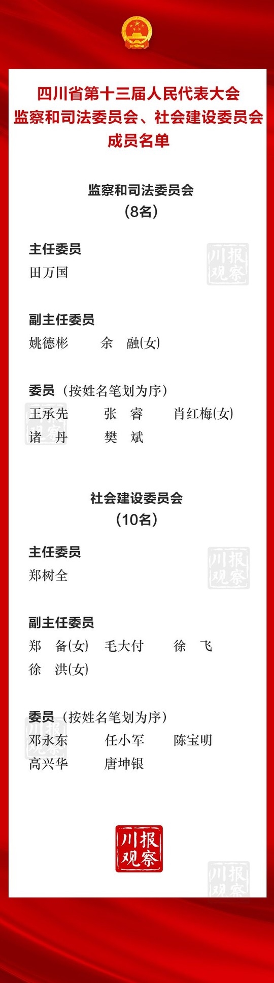 四川在线消息(记者 刘佳 袁婧)1月19日下午举行的四川省十三届人大二次会议第三次全体会议上,表决通过了四川省第十三届人民代表大会监察和司法委员会、社会建设委员会成员名单。