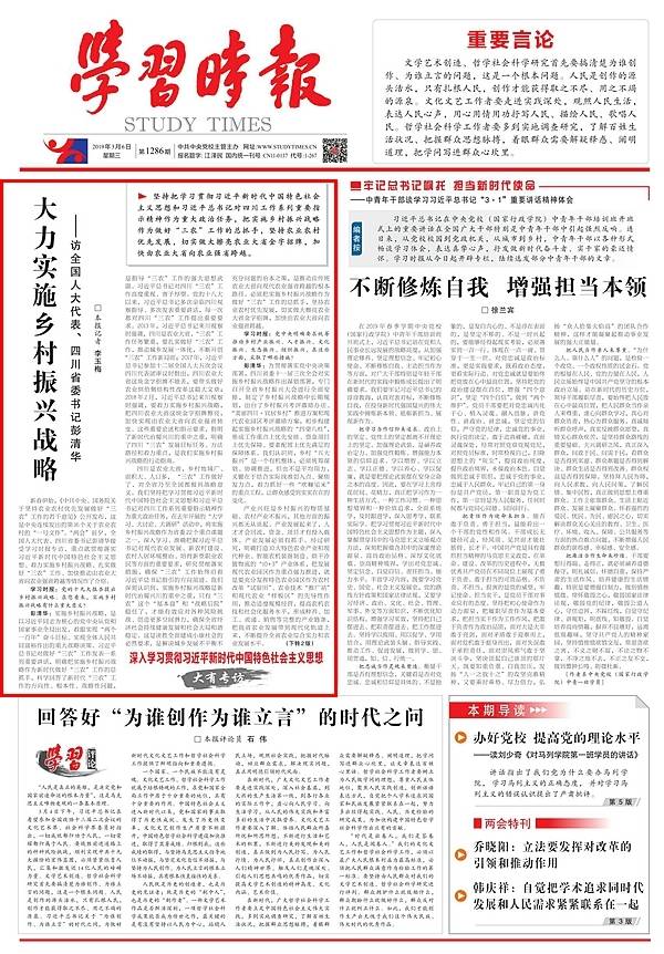 编者按:3月6日,学习时报头版头条专访全国人大代表、四川省委书记彭清华,重点就贯彻落实习近平新时代中国特色社会主义思想、着力实施乡村振兴战略、扎实做好“三农”工作、加快推动由农业大省向农业强省跨越等情况作了介绍。
