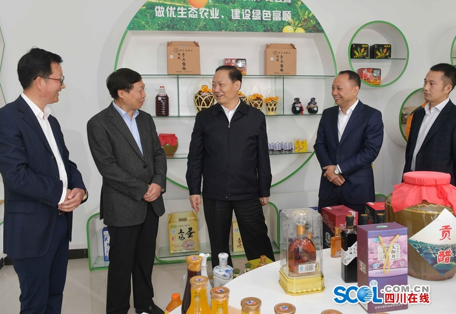 4月11日,省委书记彭清华到富顺县狮市镇马安村调研,在农产品展示厅了解特色农产品品牌建设和市场销售情况。