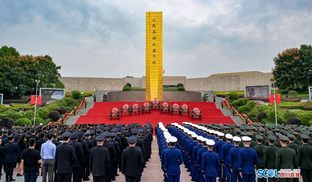 天地英雄气,千秋尚凛然。成都市烈士陵园苍松翠柏环抱,追思大道一侧展陈着一幅幅图片,展示了全省烈士纪念设施规划建设、保护管理、作用发挥等方面取得的成效,让瞻仰追思的氛围更加浓厚。陵园内,革命烈士纪念碑巍然耸立、静穆庄严。参加仪式的各界代表,面向纪念碑整齐列队。