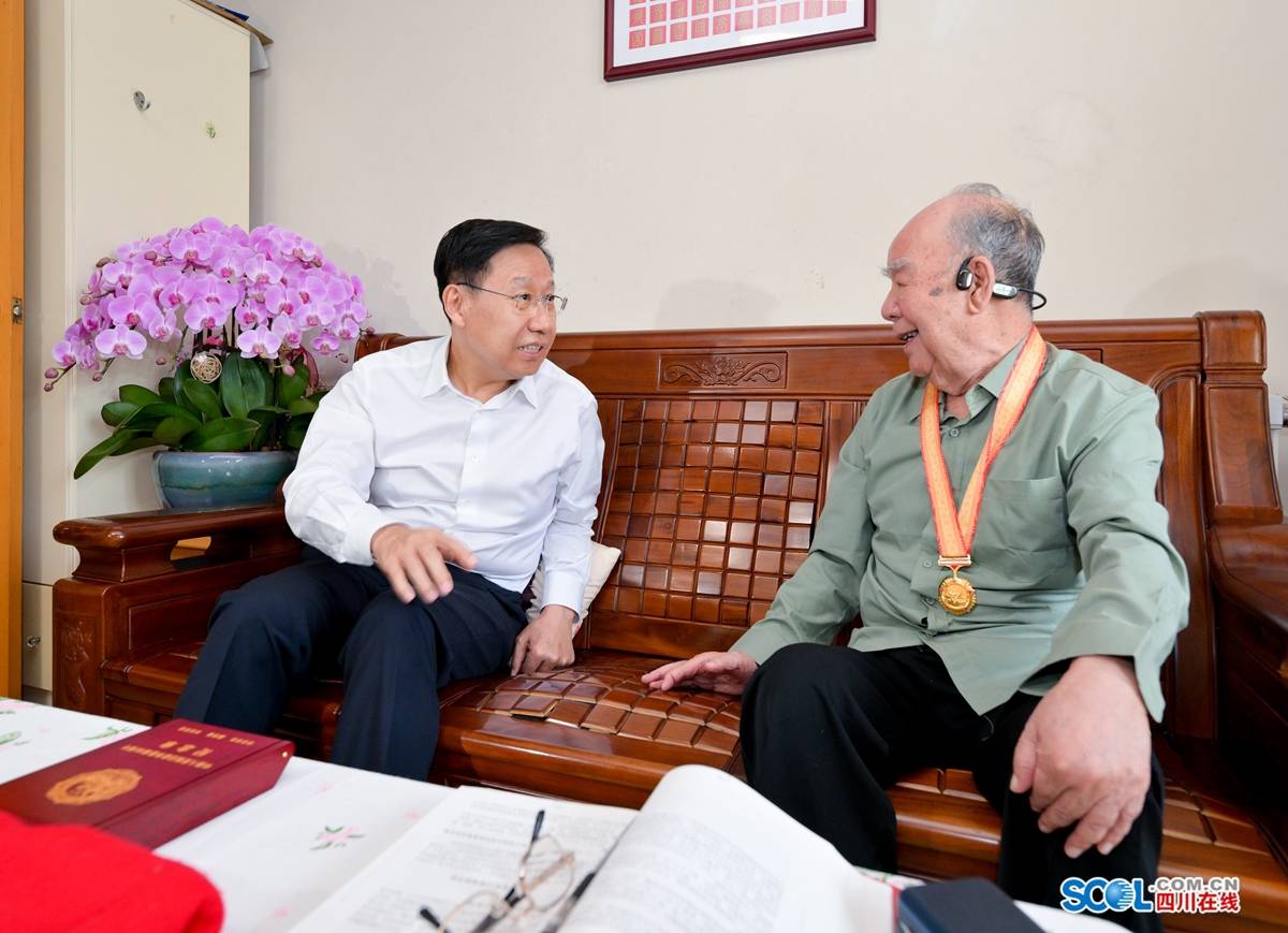 今年99岁的张玉昆、98岁的孟宪华都是参加过抗日战争的老战士、老同志。张玉昆1939年参加革命,曾担任八路军120师青年队战斗剧社宣传员,在陕甘宁边区积极投身大生产,担负保卫党中央的任务,曾被选为学习楷模;孟宪华1941年参加部队,在与日寇的英勇战斗中两次负伤,解放战争时期还参加过淮海战役、渡江战役等,多次荣立战功。王晓晖来到两位老人家中,与他们促膝交谈,倾听老人回忆当年投身革命、抗战报国的峥嵘岁月,关切询问生活起居和身体健康状况。王晓晖说,在中国人民抗日战争胜利80周年之际,党中央、国务院、中央军委就颁发纪念章作出部署,充分体现了以习近平同志为核心的党中央对参加过抗战的老战士、老同志的深切关怀。你们为夺取抗战胜利、争取民族独立和人民解放作出了重要贡献,为新中国建设特别是四川改革发展付出了毕生心血,党和人民不会忘记你们立下的卓越功勋。全省各地各部门要落实好各项拥军优抚政策,用心用情关爱老战士、老同志,及时帮助解决实际困难,照顾好他们的晚年生活,让他们时刻感受到党和政府的温暖。要传承弘扬伟大爱国主义精神、伟大抗战精神,大力宣传抗战革命先烈、老战士、老同志的英雄事迹和高尚情操,教育引导广大干部群众继承先辈遗志,弘扬革命传统,矢志干事创业,在全社会营造见贤思齐、崇尚英雄、争做先锋的浓厚氛围,为奋力谱写中国式现代化四川新篇章凝聚强大力量。