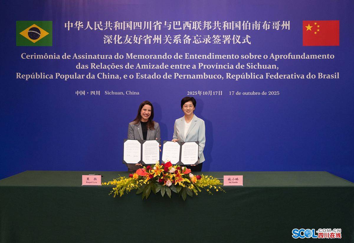 10月17日,四川省与巴西伯南布哥州在成都签署深化友好省州关系备忘录。省委副书记、省长施小琳会见伯南布哥州州长里拉,并分别代表双方签约。