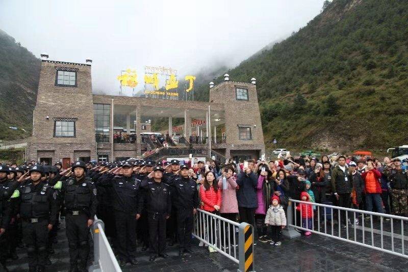 同样在国庆大假首日,北京时间7时左右,天还没大亮,秋日的稻城亚丁景区寒意渐浓,但却丝毫没有影响人们参加国庆升旗仪式的热情。此时的游客中心广场,早已人潮涌动,来自全国各地的许多游客也驻足肃立,他们中间有年近古稀的老人,也有满脸稚气的孩子,有军人和学生、也有各族群众,人们喜气洋洋地来到这里,等待着即将举行的升国旗仪式。