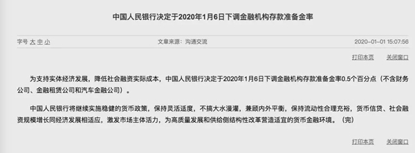 四川在线消息(记者 卢薇)2020年1月1日,降准“靴子落地”。中国人民银行今日宣布:1月6日降准0.5个百分点!