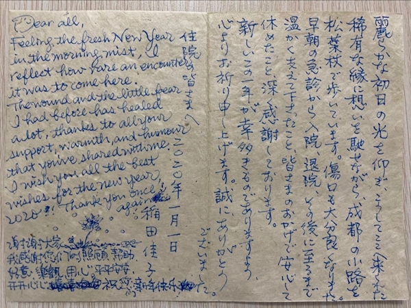 四川在线消息(记者 石小宏)“这里的每一个人都那么友好,我一点都不觉得无助。”说话的是来自日本的英语教师佳子。她在成都市第二人民医院烧伤整形科住院期间,科室的医护人员给予她的悉心的照顾、耐心的帮助、用心的鼓励,让只身一人来医院看病的她不觉得孤单。佳子还亲手制作了新年祝福卡片,并手写了一封中、日、英三种语言文字的感谢信,送到的医护人员手中,以表达她的感激之情。