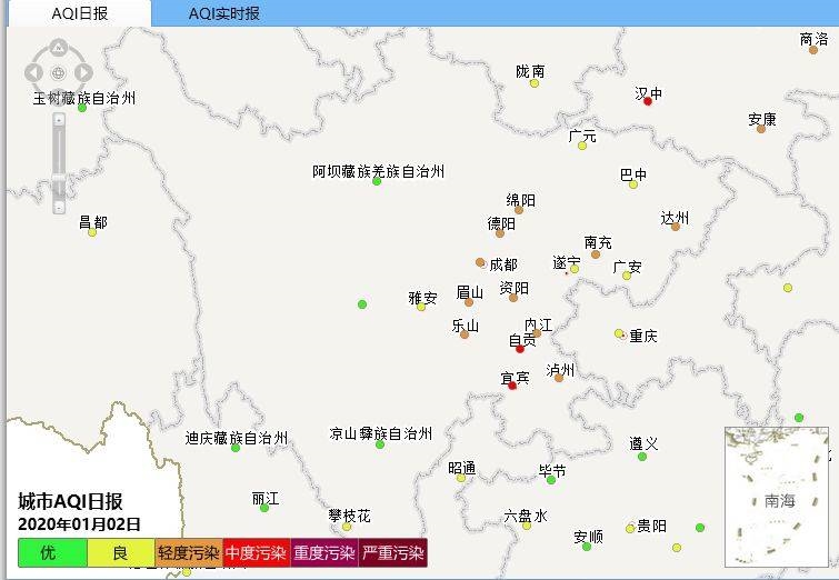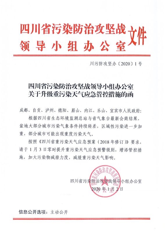 2020年1月2日,根据省生态环境监测总站与省气象台会商情况,盆地大部分城市污染气象条件持续转差,区域性污染将进一步加重,按照省污染防治攻坚战领导小组办公室的统一部署,成都、自贡、泸州等8市于1月3日零时将重污染天气黄色预警级别提升到橙色,切实强化管控,加大污染物减排力度。