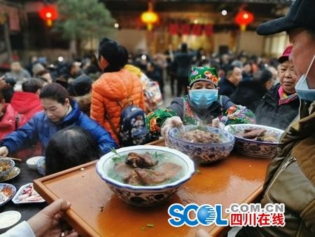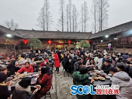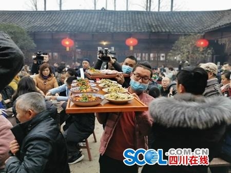 四川在线消息(记者 丁宁 摄影报道)1月4日下午5时起,大邑县悦来古镇斜江河边,随着堂倌故意拖长声音的“喊堂”,锣鼓声响,鞭炮齐鸣,由《川味》纪录片团队打造的“川味盛宴”首场宴席,在该镇盐井村一个百年川西民居四合院隆重开席,数百位来自全国各地的宾客不仅品尝了一次地地道道的川味坝坝宴,还大饱眼福,亲眼见证了非物质文化传承技艺在传统宴席中的融会贯通。这场怀旧味儿十足的宴席,让不少宾客直呼“好像回到了小时候”。