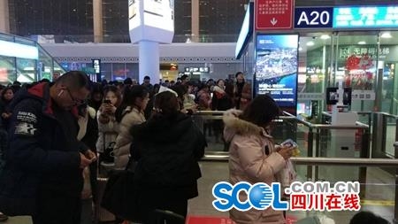 由于列车临时晚点,记者在现场看到,对接C6220次列车的成都东站A2021,B2021检票口前站满前了来乘车的乘客。为获取最新消息,大家纷纷拿出手机刷起了微信和微博。