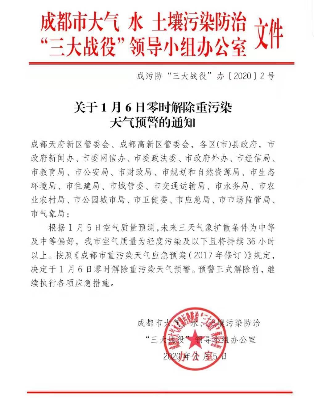 四川在线消息(记者 吴亚飞)1月5日,成都市大气、水、土壤污染防治“三大战役”领导小组办公室通知,根据1月5日空气质量预测,未来三天气象扩散条件为中等及中等偏好,成都市空气质量为轻度污染及以下且将持续36小时以上。按照《成都市重污染天气应急预案(2017年修订)》规定,决定于2020年1月6日零时解除重污染天气预警。