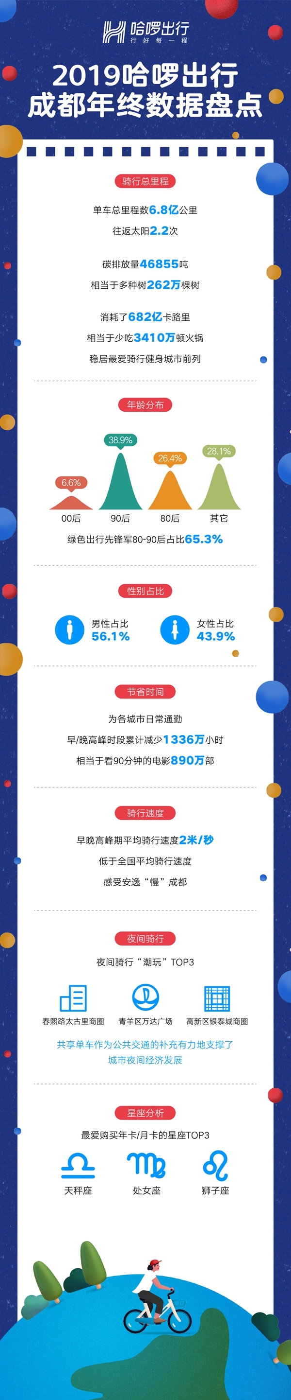 截至2019年12月31日,哈啰出行两轮大数据显示,在过去的2019年,成都用户单车骑行总程达6.8亿公里,较去年上升4000万公里,位居全国前列。地球和太阳距离1.5亿公里,按此计算,成都市民一年的单车骑行总里程相当于往返地球太阳2.2次,为这座城市减少了4685万千克碳排放,相当于植树262万株,大家为成都的“蓝天保卫战”作出了巨大贡献。