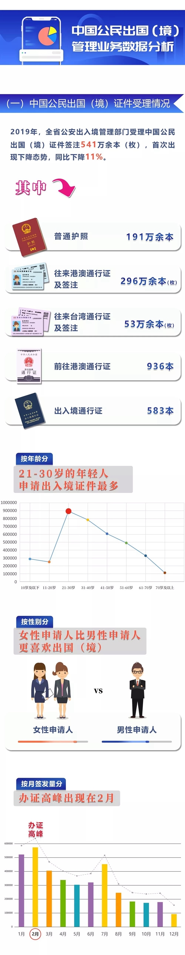 从申请人年龄段分布来看,21岁至30岁的年轻人申请出入境证件最多,从申请人性别来看,女性申请人比男性申请人更喜欢出国(境)。从办理数量分布月份来看,办证高峰出现在2月。