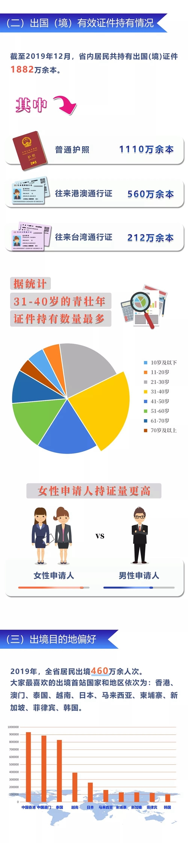 截至2019年12月,四川省内居民共持有出国(境)证件1882万余本,据统计,31-40岁的青壮年证件持有数量最多。