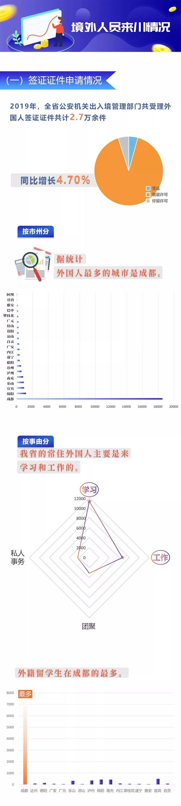 境外人员来川情况如何?2019年,四川公安机关出入境管理部门共受理外国人签证证件2.7万余件,同比增长4.7%,据统计,全川范围内,外国人最多的是城市为成都。按照申请事由来看,四川的常住外国人主要是来学习和工作,外籍留学生在成都最多。