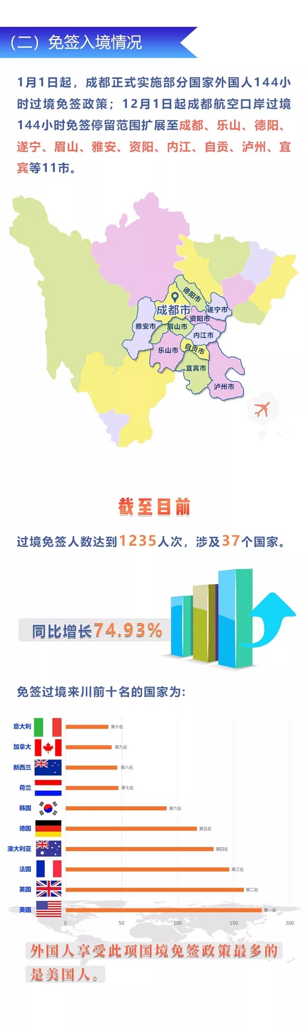 截至目前,过境免签人数达到1235人次,涉及37个国家,同比增长74.93%。免签过境来川的前10名的国家依次为:美国、英国、法国、澳大利亚、德国、韩国、荷兰、新西兰、加拿大、意大利。