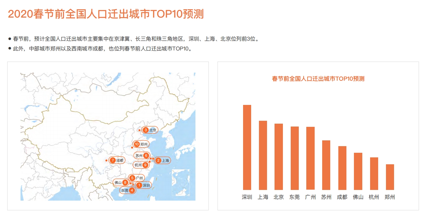 百度地图报告显示,全国热门人口迁出城市主要集中在京津翼、长三角和珠三角地区,沿海城市占大部分。西南城市成都,作为周边地区人口的重要就业地,也位列十大热门人口迁出城市之中。深圳成为了春运人口迁出第一大城市。
