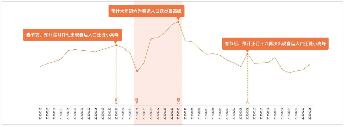 据《报告》显示,2020年春运人口迁徙整体趋势表现为,春节假期前全国人口迁徙逐步攀升,腊月廿七(1月21日)出现人口迁徙小高峰。随后人口迁徙逐步回落,除夕当天达到最低水平。紧接着,春节假期中迁徙逐步上升,最高峰预计出现在大年初六(1月30日)。春节假期后,全国人口迁徙逐步回落,但因部分人群正月十五过后才开始返程,预计正月十六(2月9日)将再次出现春运人口迁徙小高峰。