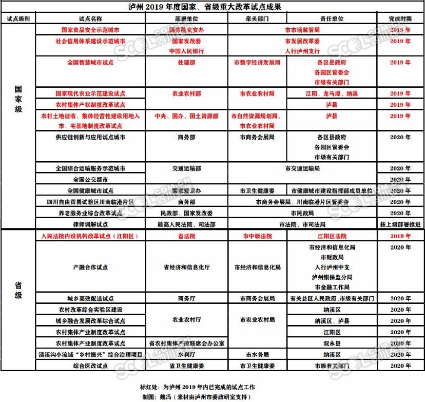 泸州2019年度国家、省级重大改革试点成果表。