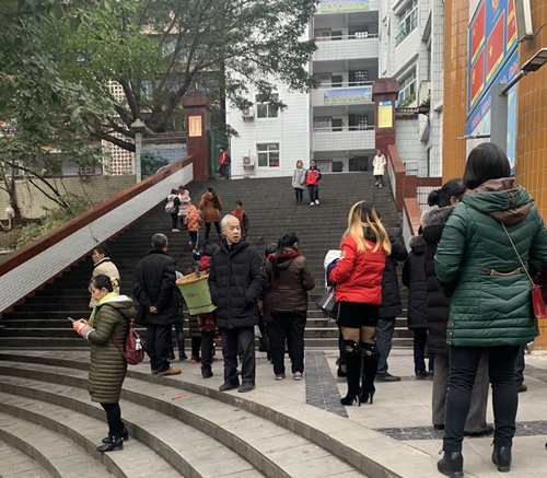 12月24日下午5点10分,家长在学校内等待接孩子。(杨迎 摄)