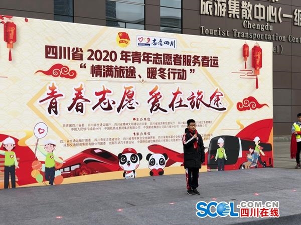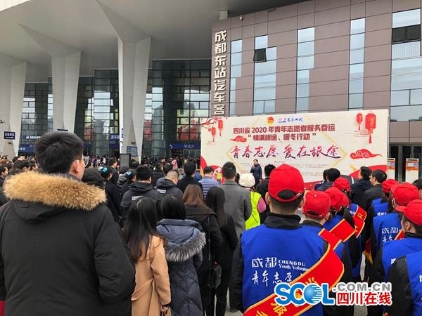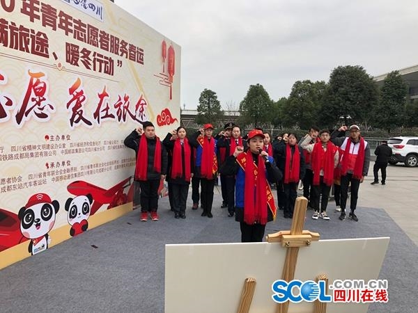 四川在线消息(记者 吴浩 文/图)1月10日是2020年春运首日,在成都东站汽车客运站广场近百名春运志愿者宣誓声中,“青春志愿·爱在旅途”四川省2020年青年志愿服务春运“情满旅途、暖冬行动”正式启动。全省各级团组织目前已依托“志愿四川”信息平台不断发布春运志愿服务项目,预计将有超过2万名志愿者参加服务。