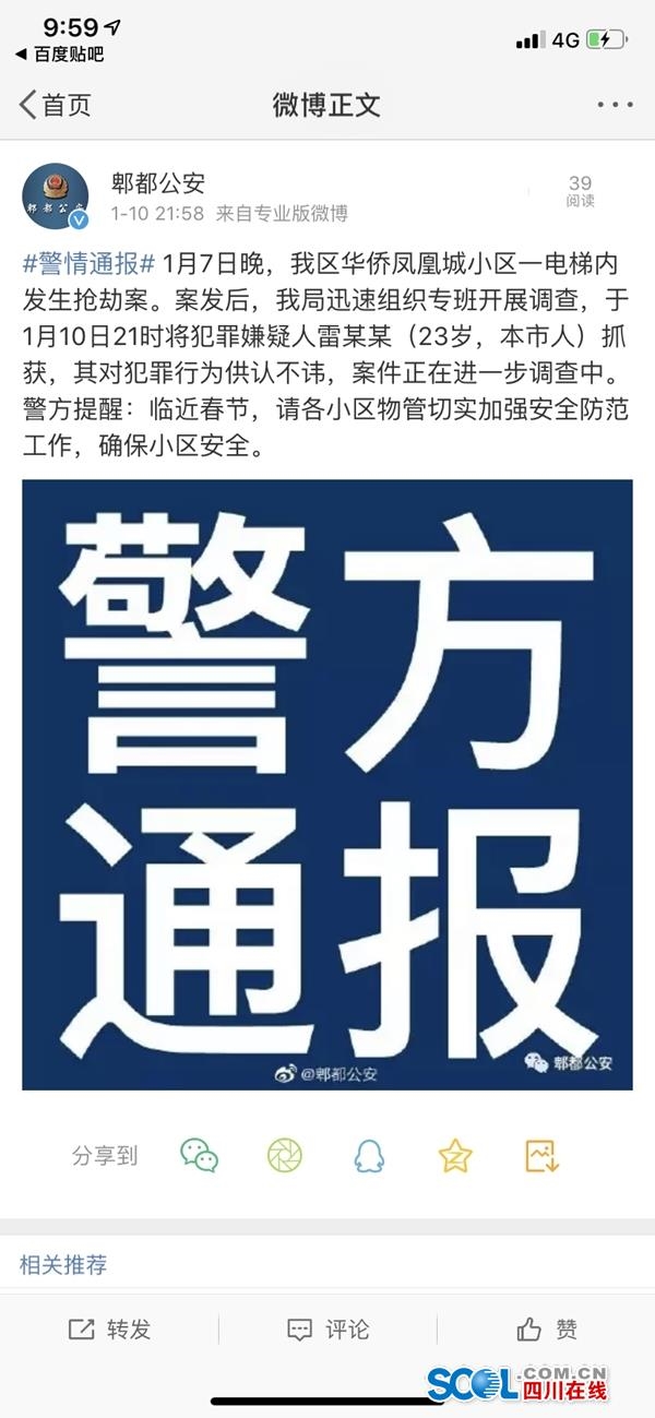 四川在线消息(记者 伍力)1月10日晚,成都市公安局郫都区分局发布警情通报。通报显示,1月7日晚,该区华侨凤凰城小区一电梯内发生抢劫案。案发后,警方迅速组织专班开展调查,于1月10日21时将犯罪嫌疑人雷某某(23岁,本市人)抓获,其对犯罪行为供认不讳,案件正在进一步调查中。警方提醒:临近春节,请各小区物管切实加强安全防范工作,确保小区安全。