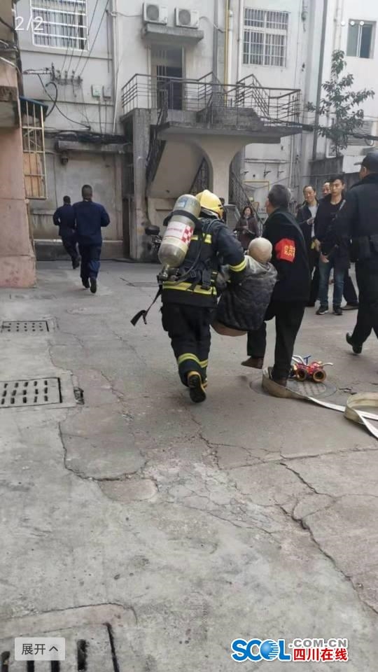 记者从照片看到,周边的建筑被浓烟笼罩,一老人被消防队从现场救出。