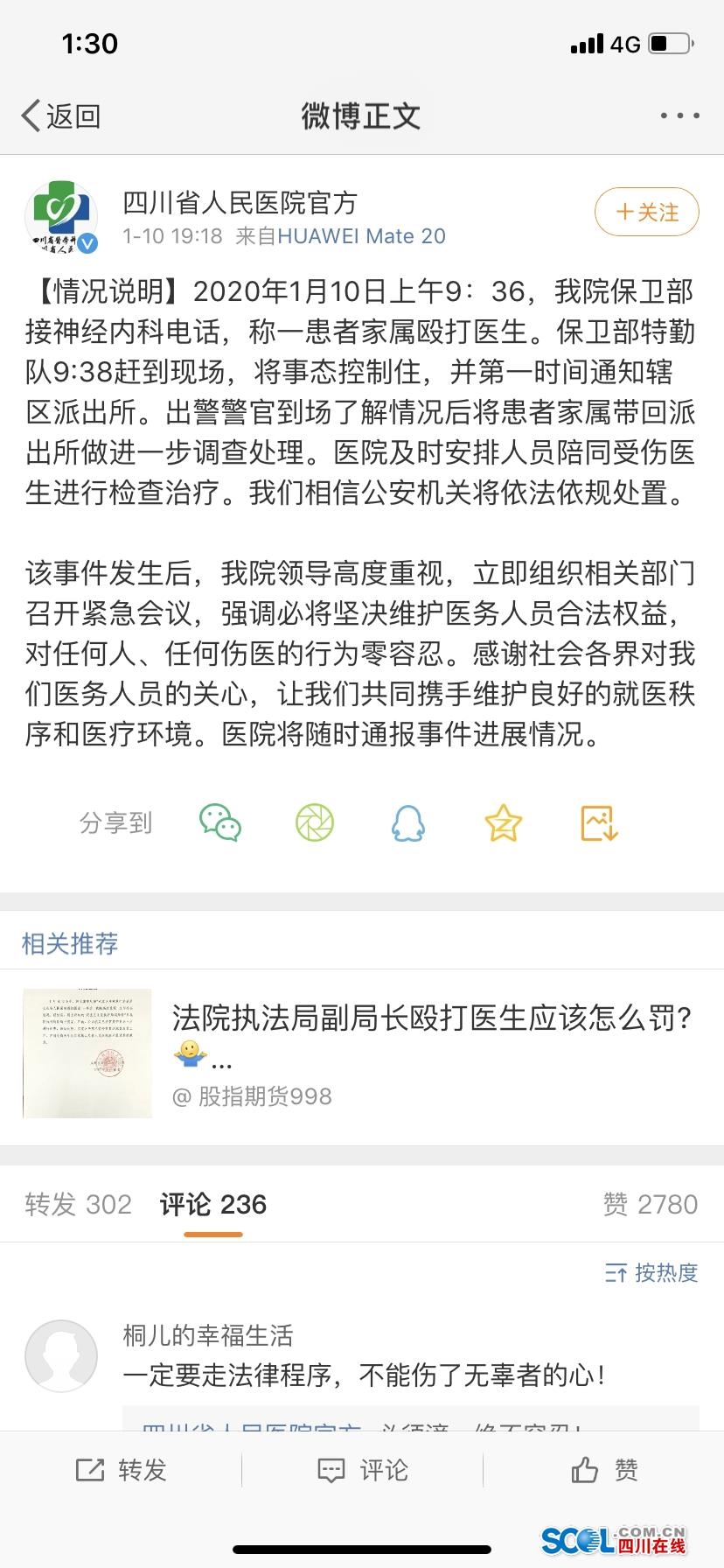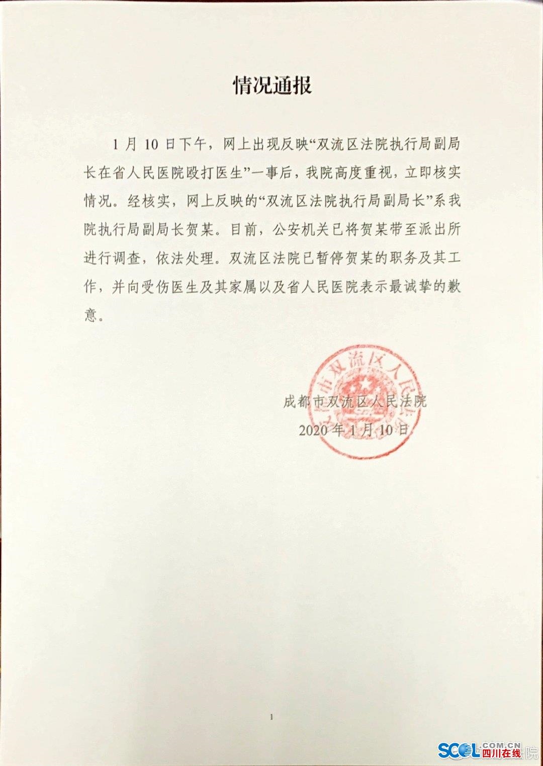 四川在线消息(记者 伍力)1月10日,有网友发文称同事张医生被患者家属殴打,鼻骨骨折。打人者系成都市双流区人民法院执行局副局长,该副局长的家人在该医院就诊。随后,省医院和双流区人民法院分别发布消息予以确认,其中,双流区人民法院官方微博发消息表示,殴打医生的涉案人系该法院执行局副局长贺某,已被警方带至派出所进行调查。贺某的职务及工作被暂停。