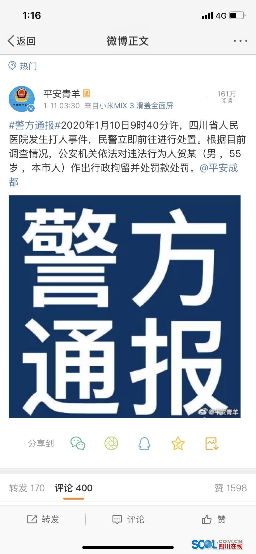 1月11日凌晨,成都市公安局青羊公安分局发布警情通报。通报显示,1月10日9时40分许,四川省人民医院发生打人事件,民警立即前往进行处置。根据目前调查情况,公安机关依法对违法行为人贺某(男,55岁,本市人)作出行政拘留并处罚款处罚。