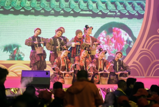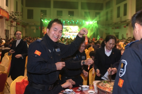 “三十晚上年夜饭,欢欢喜喜过大年”“有钱没钱,回家过年。新年总是寄托了我们太多的情感与期盼。除夕团圆夜,守岁亲情浓。每到过年的时候啊,最高兴的,就是一家老小团团圆圆,其乐融融地坐在一起,吃上一顿年夜饭……”台上带着乡音的文艺表演,让来自南充市营山县的李晓明红了眼睛。51岁的李晓明在广东开公交,已经十几年没有回家过年。他告诉记者在说:“以前大年三十,我就是一个人吃碗泡面。我从来没想到还能有家乡党委政府请我们吃团年饭,我感到太幸福了。”