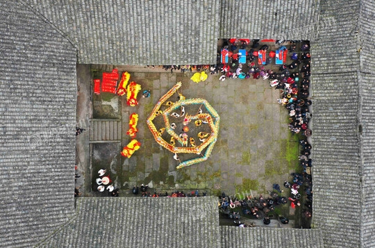 随着鼓点的起伏,龙、狮时而翘首仰视,时而相互依偎,时而翻腾跳跃,妙趣横生,栩栩如生。村中老人们则带着孙子孙女“钻龙身”,祈求平安。