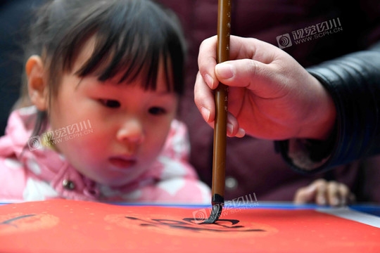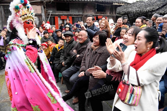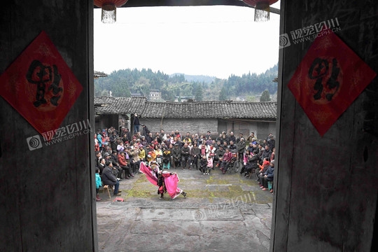 四川在线消息(记者 李向雨 摄)1月13日,农历腊月十九,四川南充市蓬安县睦坝镇瓦店村王家大院热闹非凡,来自该县新时代文明实践中心组成的龙狮、变脸、送福写春联等精彩献艺,场面蔚为壮观,吸引了众多群众前来观赏,让这具有三百多年历史的山村院落散发着浓浓的年味。