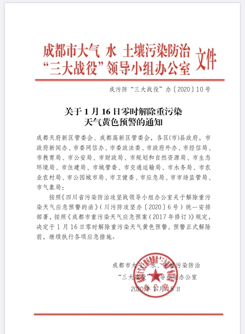 据了解,按照《四川省污染防治攻坚战领导小组办公室关于解除重污染天气应急预警的函》统一安排部署,按照《成都市重污染天气应急预案(2017年修订)》规定,决定于1月16日零时解除重污染天气黄色预警。预警正式解除前,继续执行各项应急措施。