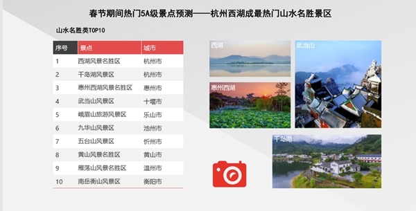 看山水名胜类,杭州西湖成为最热门5A级景点,其次是千岛湖和惠州西湖。此外,武当山、峨眉山、黄山等景区也入围了前十;