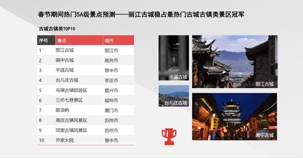 看古城古镇类,文艺青年心中的“圣地”丽江古城稳占冠军;来自四川的阆中古城、山西的平遥古城分列二三位;