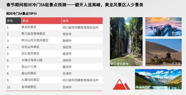 报告也预测了十大相对冷门的5A级景点。排名榜首的是黄龙风景区,其他依次为野三坡百里峡、鸣沙山月牙泉、白石山风景区、刘公岛风景区、大梅沙海滨公园、巫山小三峡、盘山风景区、九寨沟风景区、金鸡湖景区。
