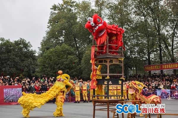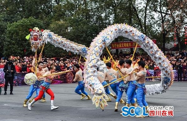 同样是国家级非物质文化遗产的沐川草龙由稻草编扎而成。表演时,数十名强健汉子,头戴草巾、身披草肩、腰系草裙、脚穿草鞋,耍龙人手不离龙,耍宝人用“宝”吸引龙头跟进,让草龙上下翻飞,做出坐、卧、行、盘、腾、穿插等各种造型,产生威猛灵动、栩栩如生的表演效果。而两条各长40余米的“雌雄”青神竹龙则采用国家级非遗项目青神竹编工艺编制而成。龙头采用六边花编织法,依形而编;龙身由鳞片和竹环连接而成。在铿锵的川剧锣鼓音乐伴奏下,青神竹龙时而神龙搅海,时而二龙戏珠,热烈奔放的风格,表达人们对吉祥幸福生活的追求和向往。