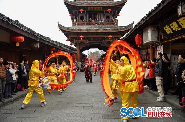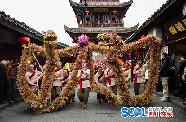 此次展演中,精彩舞狮也将同台斗舞送福。二人组合成一头狮子,一人扮演狮子头,一人扮演狮子尾。在同披狮衣的两位舞狮者密切配合下,雄狮将扑腾扑腾攀爬到6米高的管柱上,摘取由红色绸带编成的彩炮。狮口处,藏在彩炮里的“恭贺新春”对联顺势倾泻而下。这样的精彩表演源自广元旺苍高台舞狮。作为广元市非物质文化遗产项目,杨文是该项目传承人。他介绍,川北高台狮舞可分为地台狮舞、平台狮舞、高台狮舞和高杆舞狮。“旺苍高台狮舞的高台由独具川北特色的八仙桌搭建成品字形,模仿山的形态,舞狮人从下往上,一台一台舞至最高点。”这次来阆中展演,杨文团队重点展现高杆舞狮。旺苍高杆狮舞精选大巴山区特产的毛竹,加工成6米以上韧性十足的杆子,舞狮人从下往上一步一步舞至最高点,寓意步步登高。狮舞中的“夺印”“钻腾”“对面立”“灯笼架”“立天柱”“孙猴盗桃”、“哈蟆晒肚”“鸦雀下地”以及“推爬钻烟囱”等高难度动作,可称之为超凡的民间绝技。特别是川北狮舞的摆阵(即摆青)和破阵(即采青)十分惊险,更显示出奇、难、险的艺术特色。