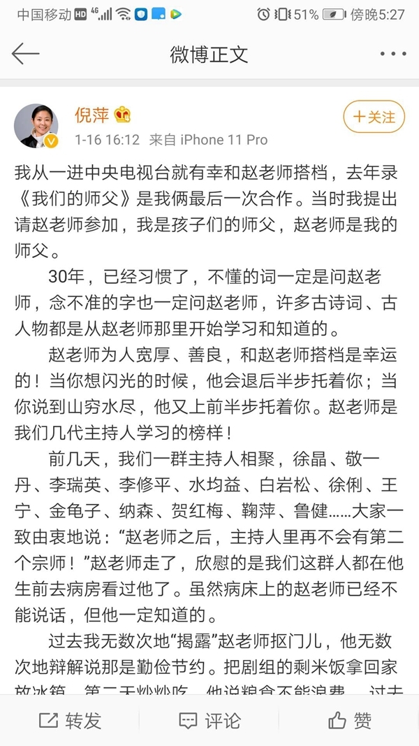 作为赵忠祥在央视多年的老搭档,16日下午倪萍也发长文悼念赵忠祥,她写道,“赵老师是“几代主持人学习的榜样”,“当你想闪光的时候,他会退后半步托着你;当你说到山穷水尽,他又上前半步托着你。”