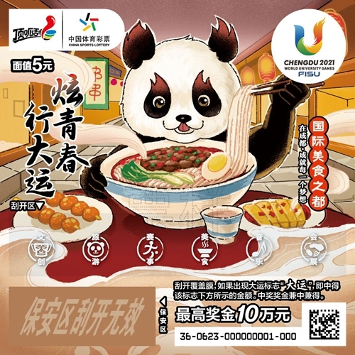 据介绍,此次首发的成都大运会主题即开型彩票一共有6款,背后是 “三城三都”城市品牌魅力,6款彩票分别对应了世界文创名城、世界旅游名城、世界赛事名城,国际美食之都、国际音乐之都、国际会展之都“三城三都”的城市形象。而彩票设计秉持文创理念,以手绘元素为主要风格。