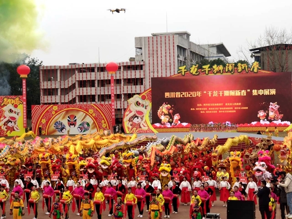 1月17日,2020年四川省“千龙千狮闹新春”群众文化活动集中展演在阆中举行。全省20个市州择优推荐的66支龙狮队伍、699名舞龙舞狮艺人及300余名民间文艺表演人员参加集中展演。