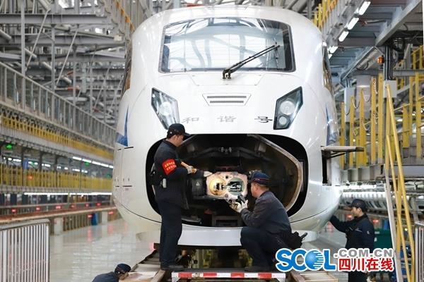 成都动车段青年突击队员在检修库检修夜行动车。 周兵摄