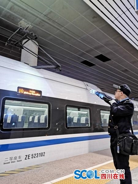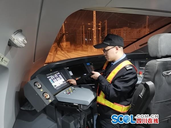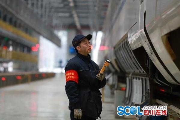 成都动车段随车机械师检查夜行动车组状态。柴少昌 摄