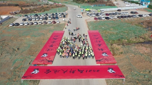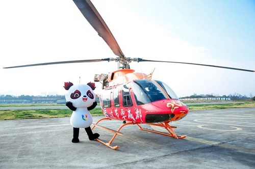四川在线消息(记者 钱晞 文/图)春节即将来临,2021年成都大运会的脚步也越来越近。1月19日,成都大运会再次送出新春祝福——三架机身涂装了大运会吉祥物和会徽的红色直升飞机“空降”东安湖体育公园建设工地,大运吉祥物“蓉宝”为一线建设者送出新春礼物。