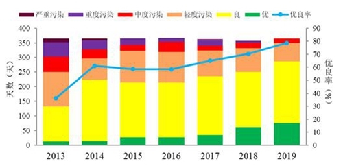 2019年空气质量级别分布及2013-2019年重污染天数变化情况