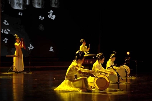 演出专门献演了《月儿高》、《霓裳羽衣》、《蜀宫夜宴》等经典的曲目,“国乐”也成为重要展示元素。据介绍,演出所有的乐音均为现场演奏,在乐器上也增加了“对话”——现场增加了合成器。合成器所发出的声音,是生长,是鸟叫、流水、雨声、风声、水声、宇宙之声……剧目中“红衣女子”作为特点元素代表着现代人的符号,音乐配以合成器,二者结合增强了整部剧的观念性。