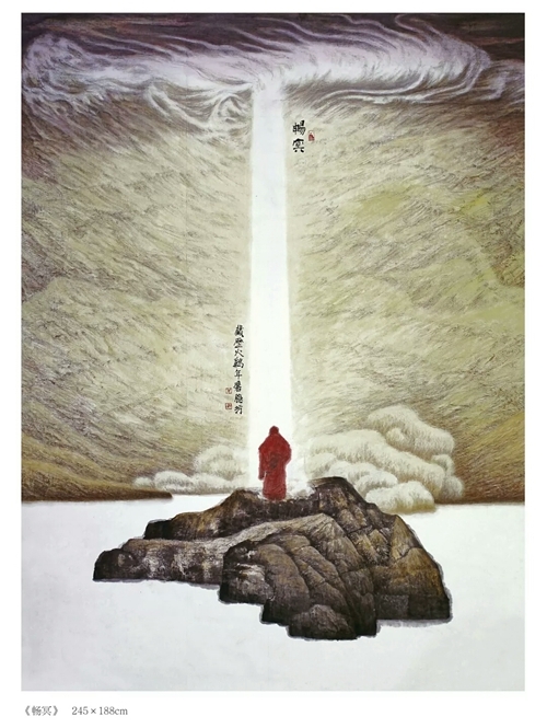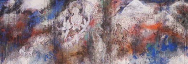 敬庭尧是中国美术家协会会员,长期在西藏采风,创作了许多表现西藏人物风情的作品,其中不少被各大美术馆收藏。此次展出作品中,其新作《瑞吉图》引得不少人驻足观看,纸本设色但似壁画斑驳,色彩瑰丽神秘,古佛造型清丽庄严,雪山白象洁净,在淋漓墨彩间,影影绰绰。