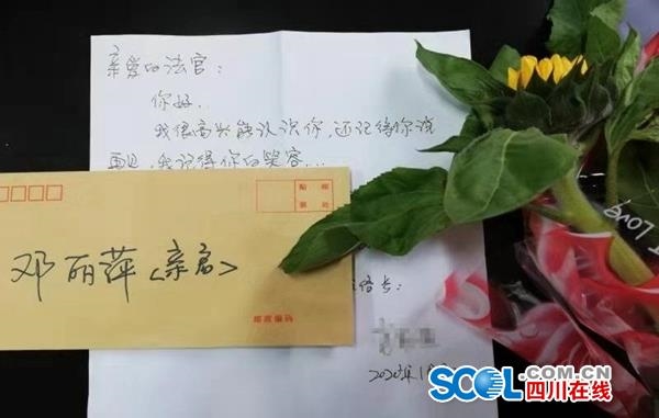 “亲爱的法官,你好!我很高兴认识你,还记得你说再见,我记得你的笑容……”近日,眉山市东坡区法院崇礼法庭邓丽萍法官收到一封来自离婚当事人的问候信和一朵温暖的太阳花,给庄严的法庭带来了冬日的暖暖温情。